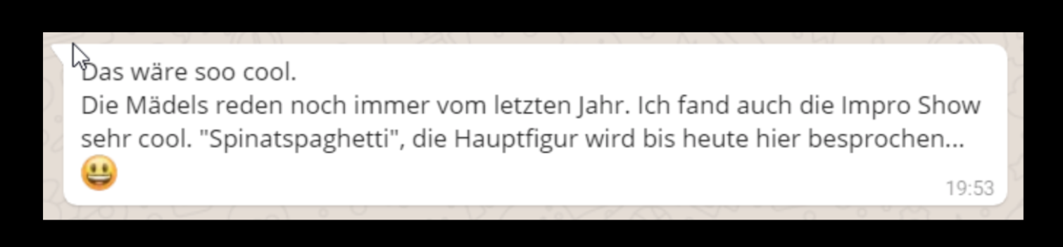 Stellt euch vor: Ihr seid mitten in einer Geschichte, die niemand kennt – noch nicht mal die Erzähler auf der Bühne! Alles entsteht hier und jetzt, aus euren Ideen und Zurufen. Was passiert? Wohin geht die Reise? In die Tiefen des Meeres? Zu einer Insel voller Pudding? Alles ist möglich – und wird es so nur an diesem Tag geben.